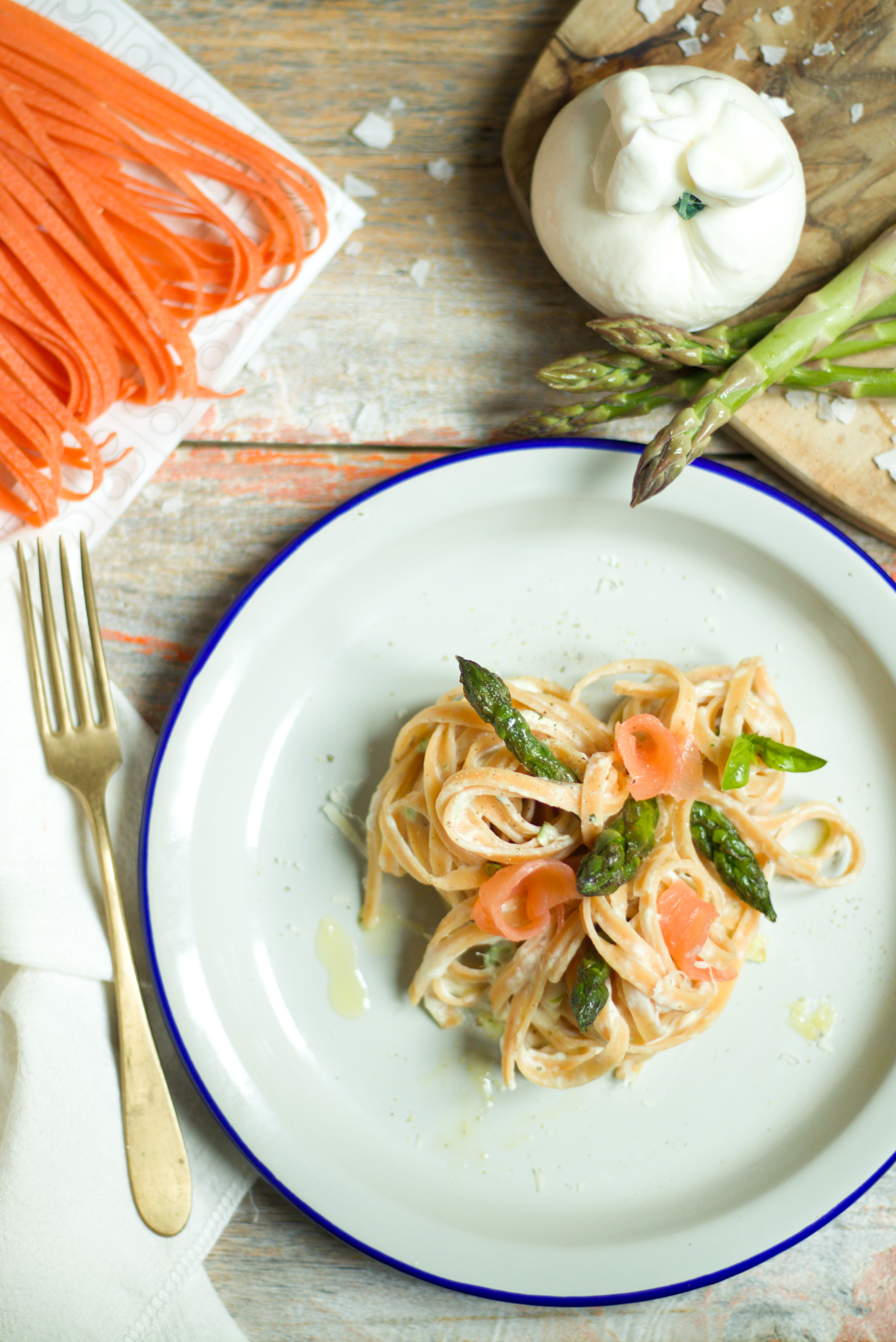 Basta frullare una burrata per ogni piatto con dell’olio, sale e pepe, delle foglie di basilico fresco e una manciata di asparagi saltati in padella. Poi sarà semplice condire la pasta con la crema, completare con le punte di alcuni asparagi scottati e del salmone affumicato. Poi olio extravergine di oliva, pepe se ce ne è voglia e parmigiano se ce ne è bisogno.