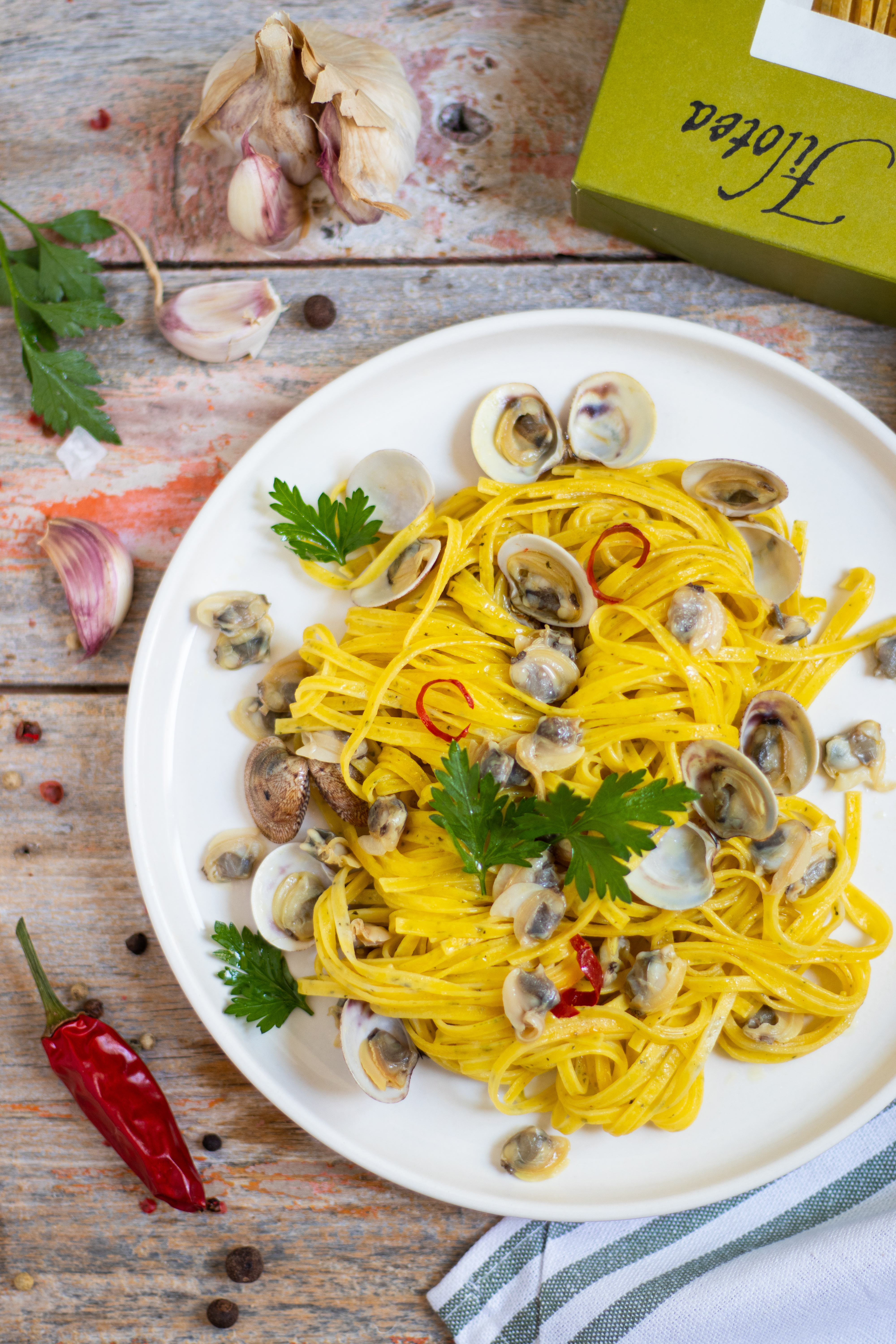 Ho lavato per bene le vongole sotto l’acqua corrente e le ho messe poi in padella con l’aglio schiacciato, il peperoncino tagliato a pezzetti e un rametto di prezzemolo. Ho fatto cuocere con il coperchio fino a che le vongole si sono aperte e poi ho eliminato l’aglio. Ho cotto le linguine al dente in abbondante acqua salata e nel mentre ho eliminato i gusci alle vongole, lasciandole qualcuna per guarnizione. Poi un salto veloce delle linguine a fuoco vivo nella padella delle vongole, una buona manciata di prezzemolo tritato, un bel giro di olio buono e poi subito a tavola con il mio vino preferito.