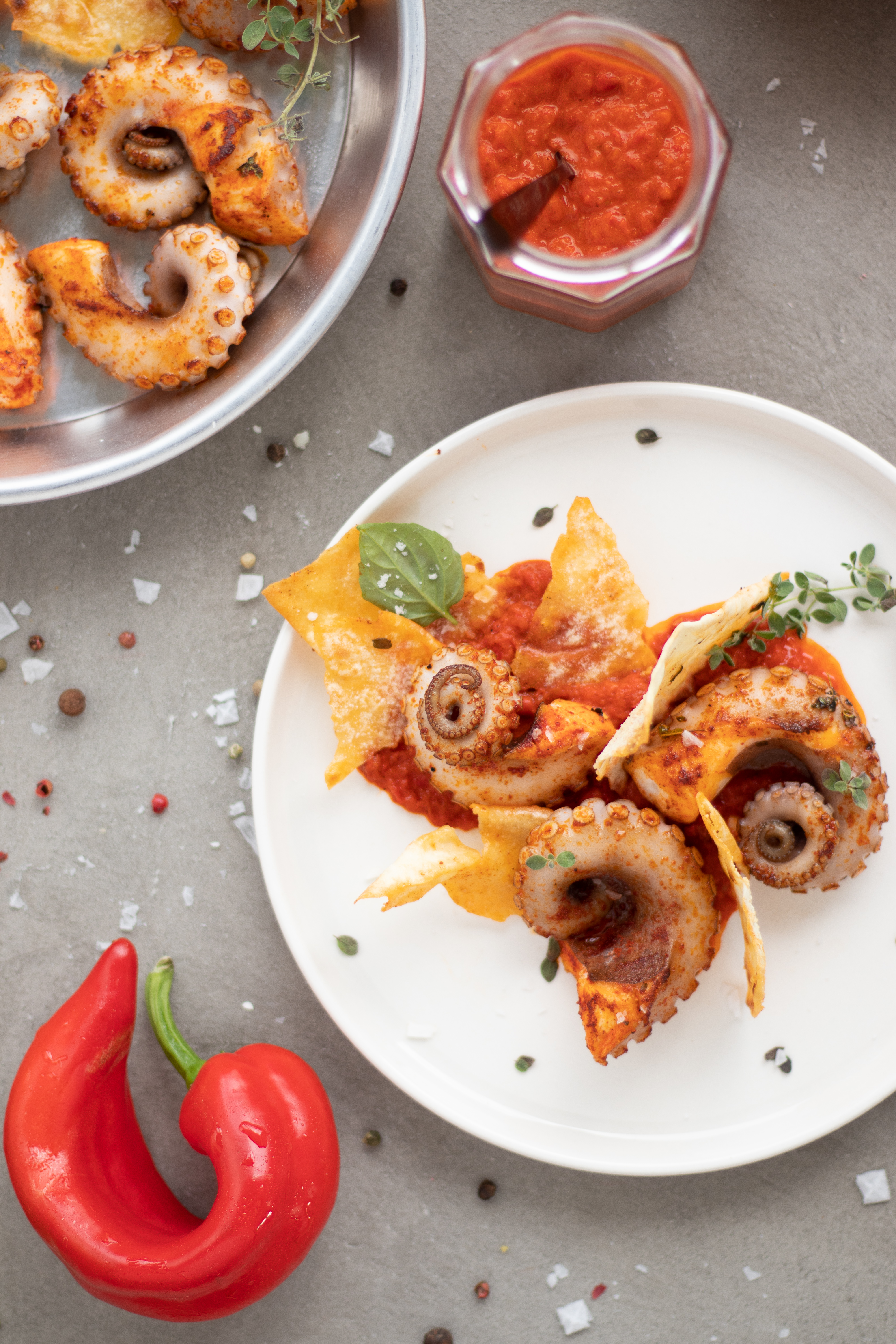Potete utilizzare il pesto di peperoni in abbinamento a del polpo bollito e poi saltato in padella con olio, paprika affumicata e del timo. Sarà un ottimo aperitivo con del pane carasau tostato nella padella di cottura del polpo.