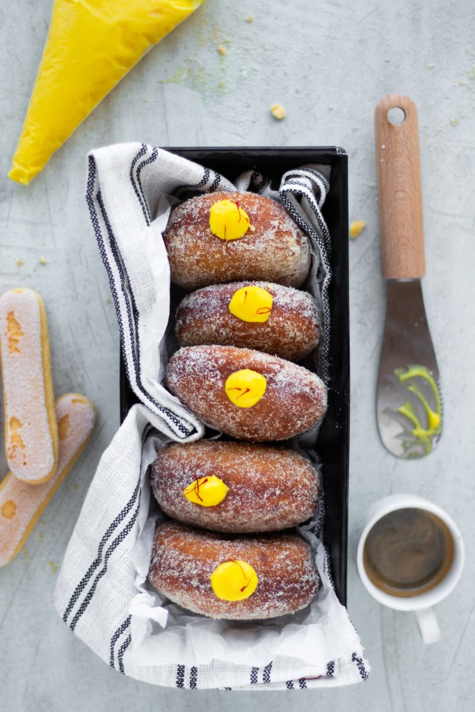 Ecco nell’attesa che arrivi lo shock della scoperta, mi sono sporcata le mani di zucchero e ho dato forma a quell’istante. Buoni, ghiotti, un po’ audaci e tremendamente soffici. Questi sono i bomboloni al caffè con polvere dolce di savoiardi ripieni di crema allo zafferano, bam!