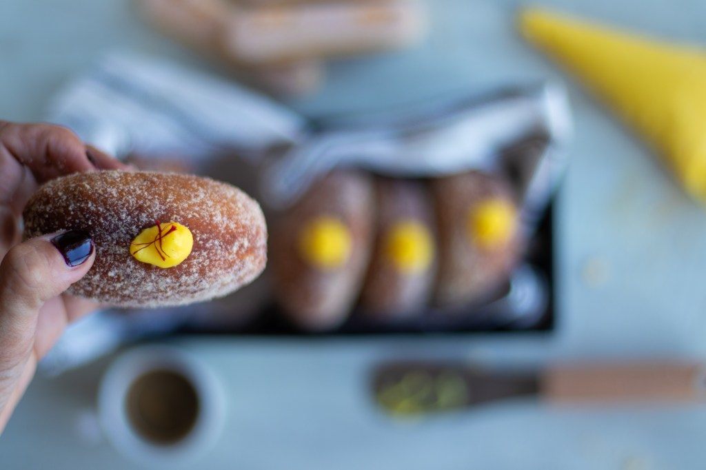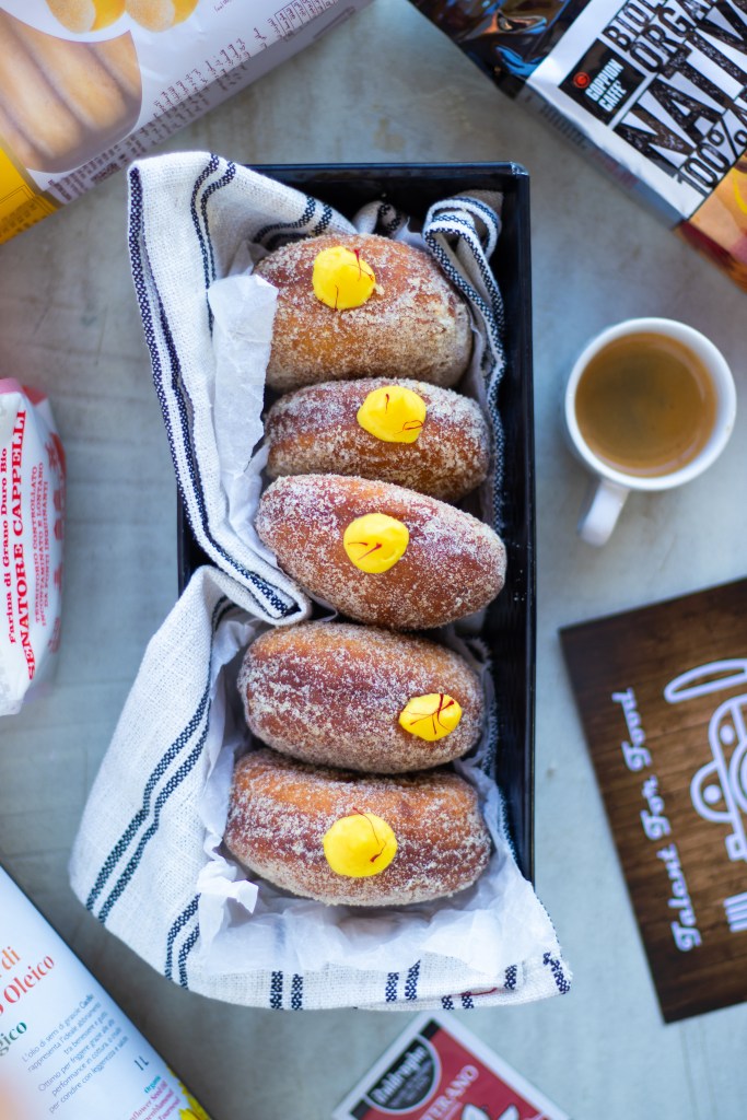Ho farcito i bomboloni con la crema allo zafferano e poi non ho saputo aspettare per assaggiarli. BAAM!