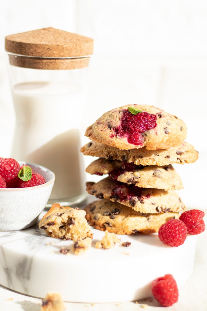Tra queste ci sarà sempre un po’ di spazio per dei biscotti buoni, anzi buoni buoni. Ho fatto i cookies con tanto cioccolato, senza sconti di burro e zucchero e la grinta dei lamponi.